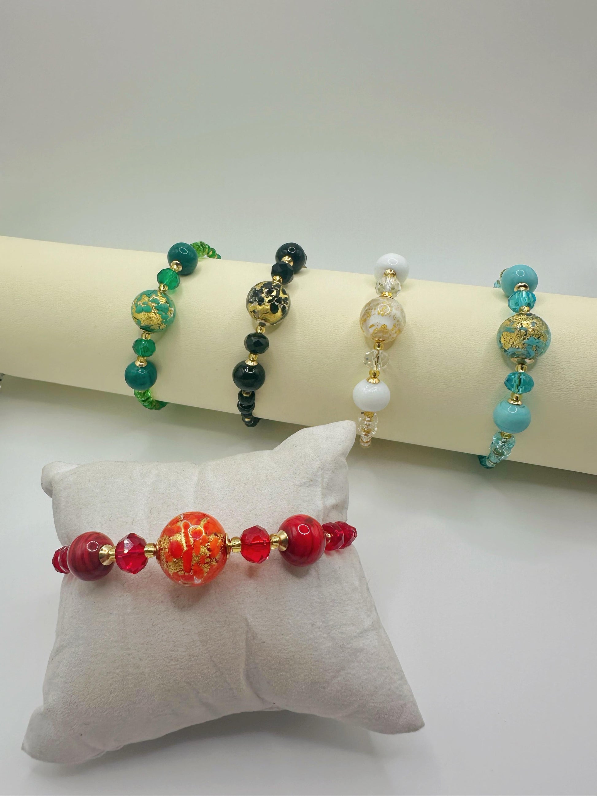 Questo bracciale rigido murano è un'opera d'arte unica dal design elegante. Realizzato con 5 perle di vetro di Murano, ogni pezzo presenta un motivo maculato unico. Un accessorio perfetto per chi ama la qualità e l'originalità.
